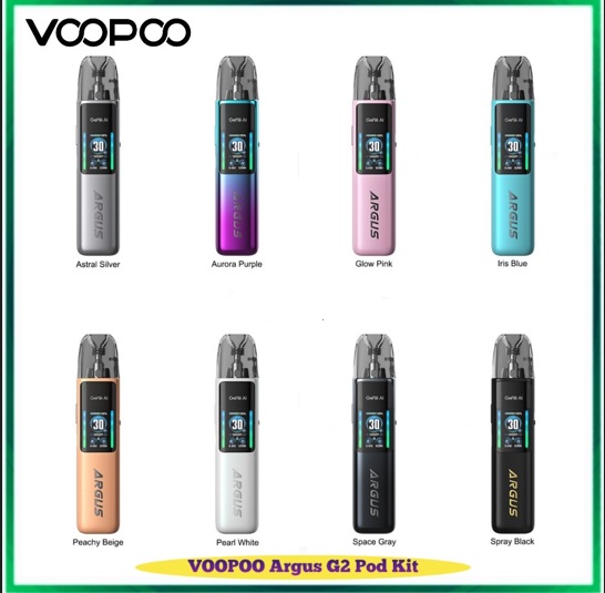 VOOPOO Argus G2 Pod Kit, a compact yet powerful vaping device crafted with Zinc Alloy and PC materials.