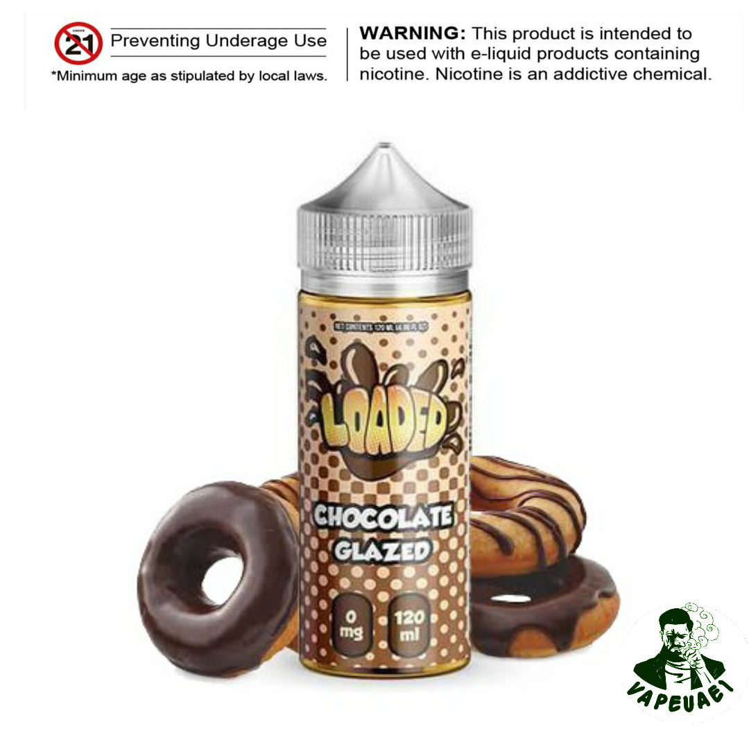 CHOCOLATE GLAZED DONUTS BY LOADED E-Liquid 120ml is the classic flavor of a chocolate glazed doughnut dipped in powdered sugar. Indulge in this rich chocolate glazed doughnut ejuice by Loaded E-Liquid.