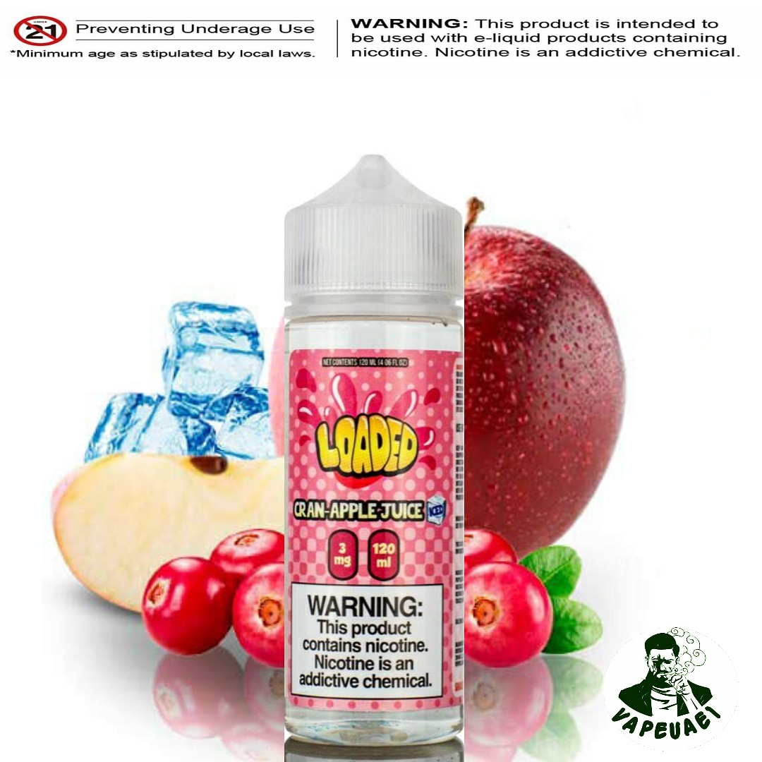 CRAN APPLE ICED BY LOADED E Liquid 120ml vape juice is a nice blend that combines tangy, sweet and tart cranberries and apples with ice-cold menthol for one of the most refreshing vaping experiences imaginable. During the hot summer months, Cran Apple On Ice vape juice will absolutely cool you down instantly.