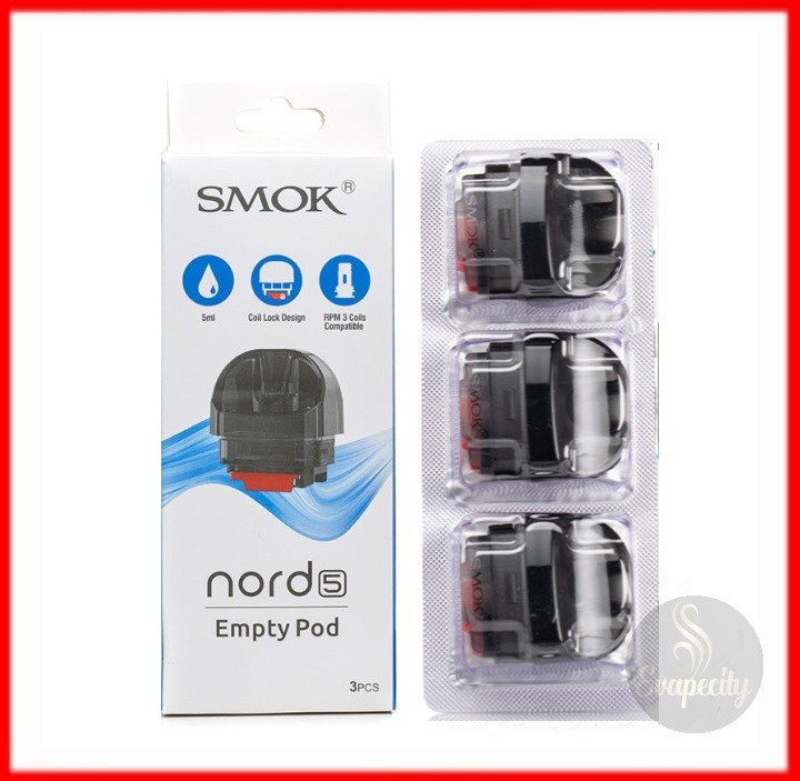 SMOK Nord 5 Replacement Pods Cartridge features a 5ml vape juice capacity, side filling system, compatible with RPM 3 coil series, and is designed for Smok Nord 5 Kit. It matches your DL satisfaction when it comes with RPM 3 coil, the wide-bore mouthpiece is ergonomic and is made of PCTG. It is connected by magnets for Smok Nord 5 Kit, each pack contains three empty pods.
