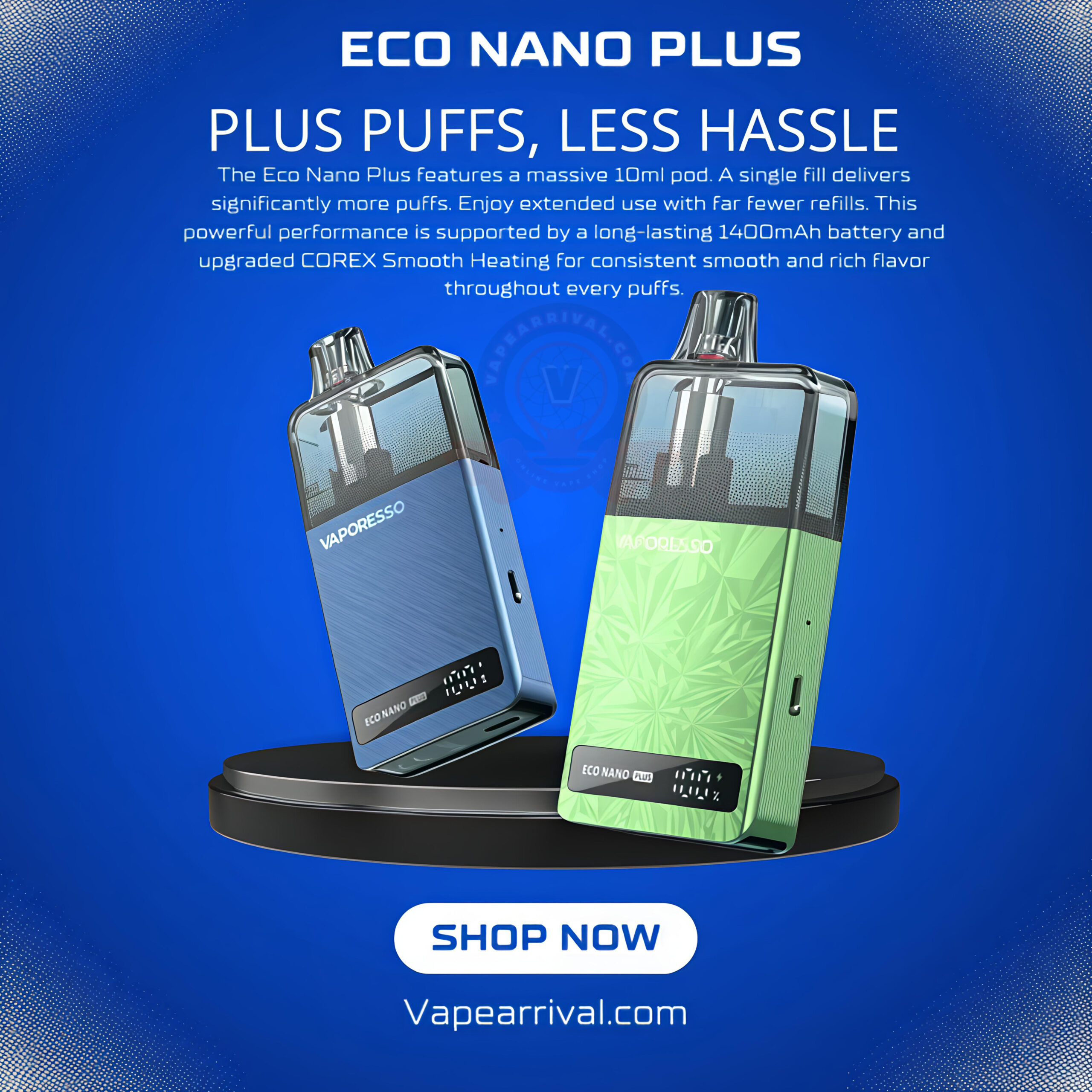 Powered by a built-in 1400mAh battery, the Eco Nano Plus easily lasts all day, while Type-C fast charging gets you back to vaping quickly. device delivers up to 23W max output, with automatic output adjustment that intelligently matches power to the pod—no buttons or settings needed.