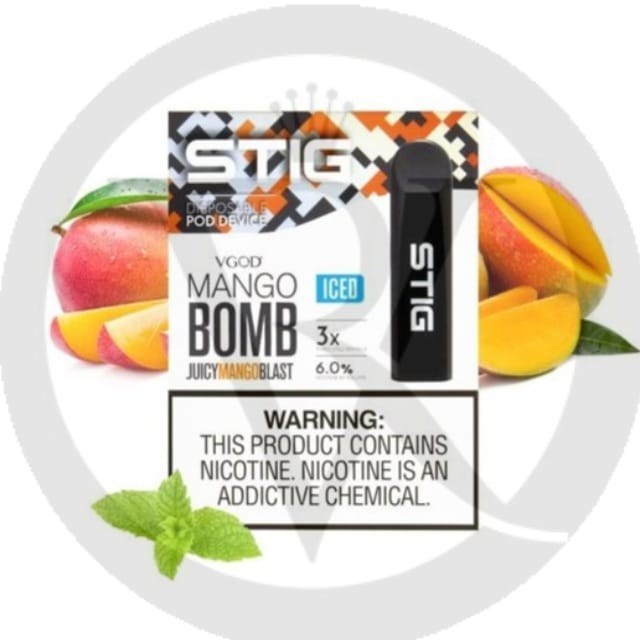 VGOD STIG DISPOSABLE ICED MANGO BOMB Get a refreshingly sweet, juicy, and tangy citrus mango flavor with a cool menthol finish on every pull of the STIG Iced Mango Bomb by VGOD. also