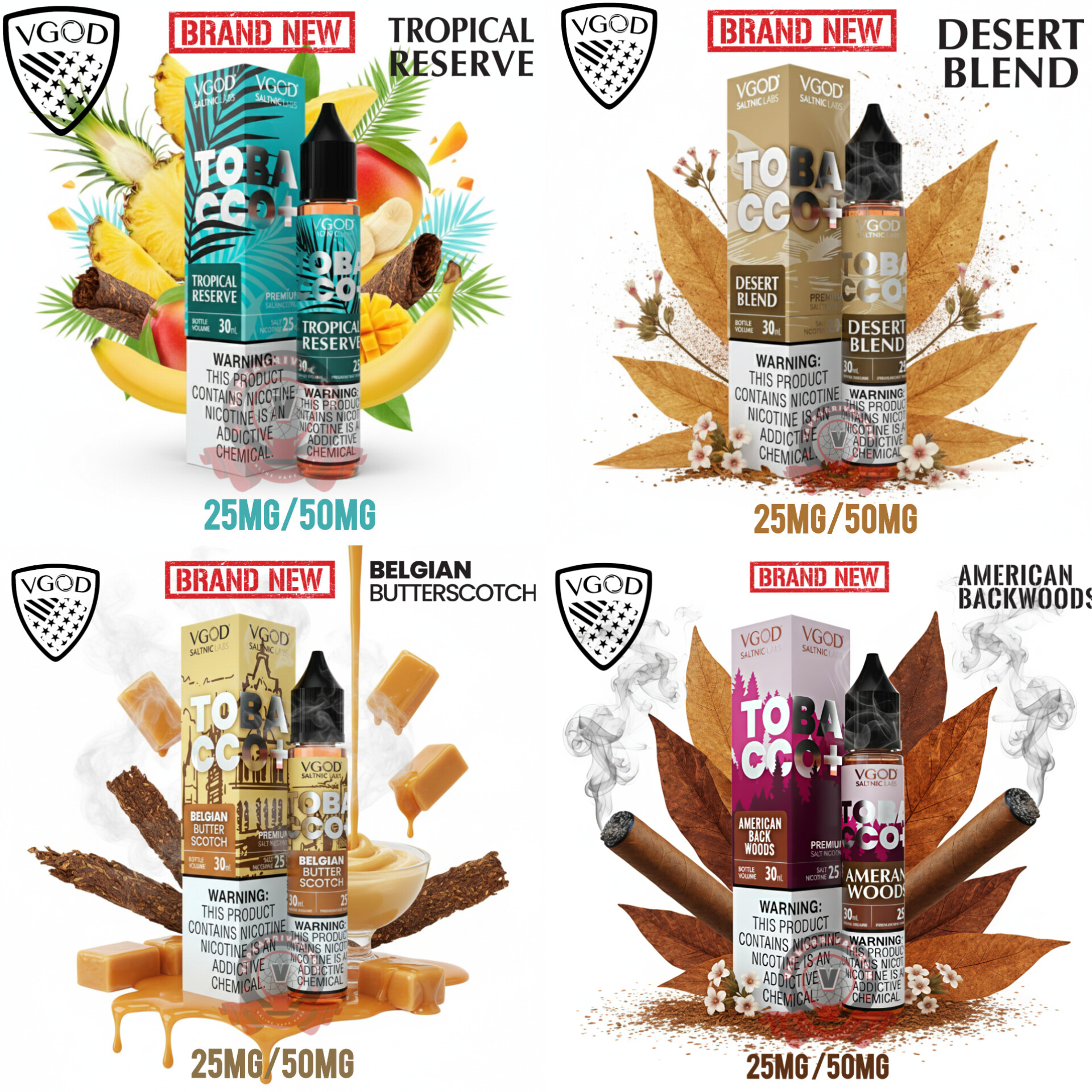 - American Backwoods: Full-bodied and bold, American Back Tobacco delivers authentic dry tobacco flavor with a hint of smoky edge.VGOD Tobacco Plus Saltnic 30ml Strong, smooth, and classic—built for those who want their vape as rugged and real as it gets.